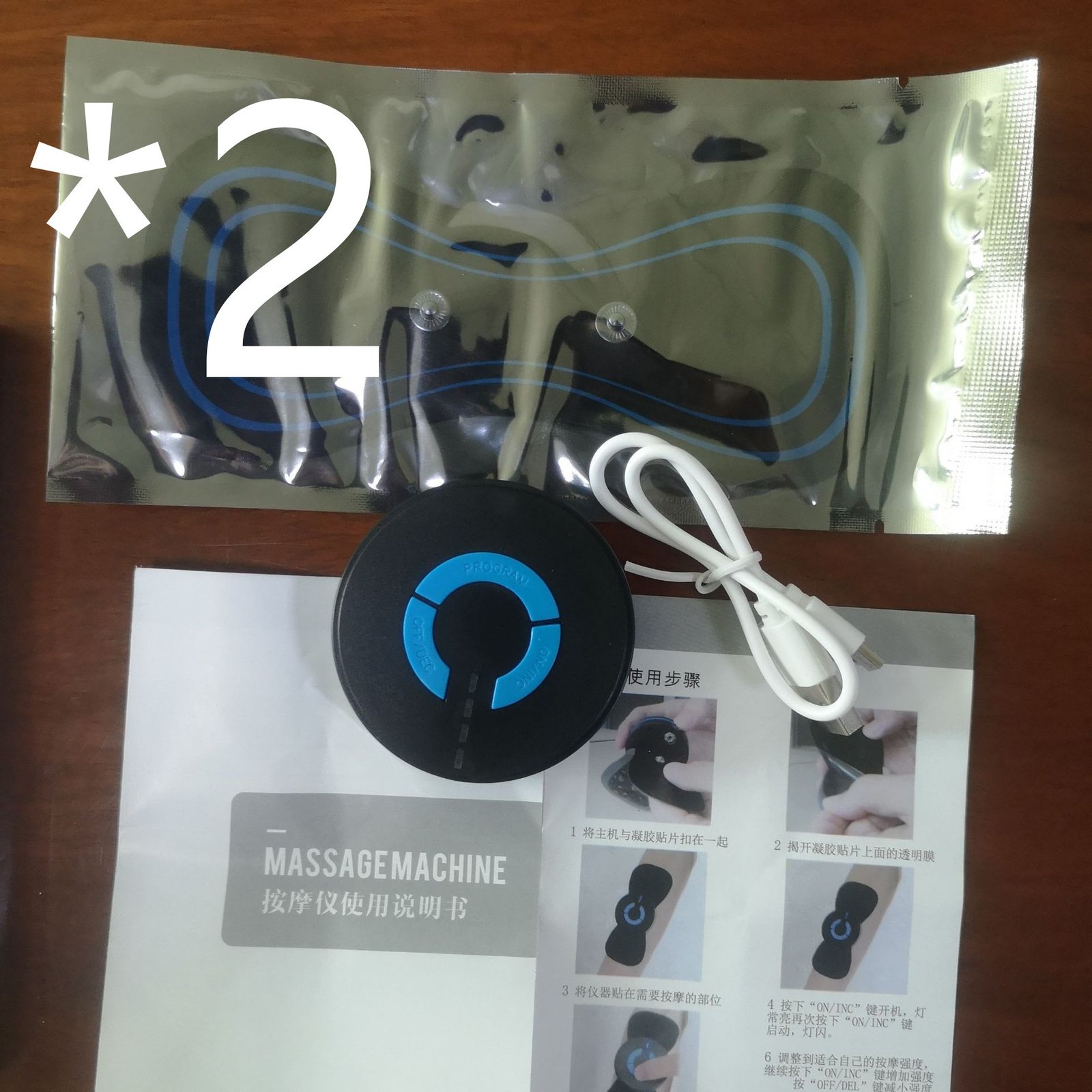 The charging product includes: host x 1pc+USB charging cable x 1pc+massage patch x 1pc+instruction manual x 1pc+color box x 1pc